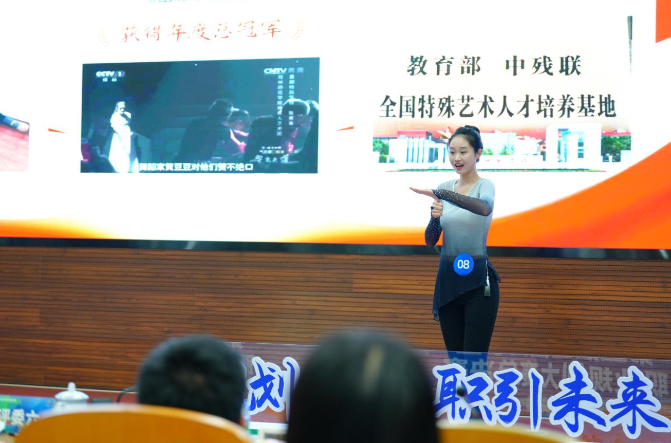 特殊教育学院高静雅同学以精湛的表现荣获就业赛道高教本科生组金奖。她以“舞动奇迹,点亮心灵,用特殊舞蹈传递爱与力量”为题,用手语演绎了自己立志成为一名特殊儿童舞蹈老师的坚定信念与不懈追求,展现了新时代大学生的责任与担当。