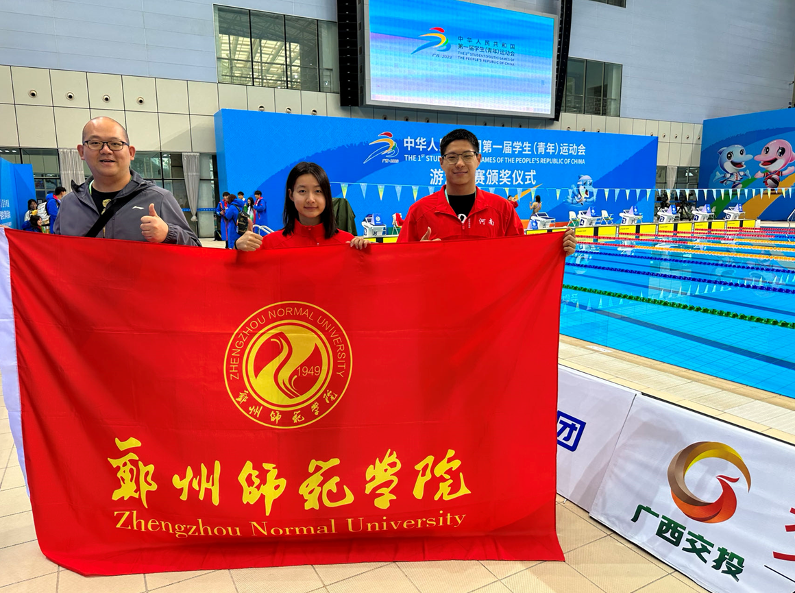 本次校园组游泳比赛分大学甲组、大学乙组、中学组,共设置116个小项,来自全国各省、自治区、直辖市及特别行政区的28支代表队的1012名运动员在泳池中展开激烈角逐。自游泳项目开赛以来,马智良、刘锐两位同学不畏强手、奋勇拼搏,发扬“泳”往直前的精神。在高手云集的比赛中,刘锐获得女子大学甲组200米混合泳第五名、马智良获得男子大学甲组4×200自由泳接力第八名的好成绩,同时马智良同学达到了国家一级运动员标准,充分地展现了郑师学子的风采。手语辅导员陈栋作为河南代表团游泳队手语翻译全程为马智良、刘锐提供无障碍手语翻译服务。