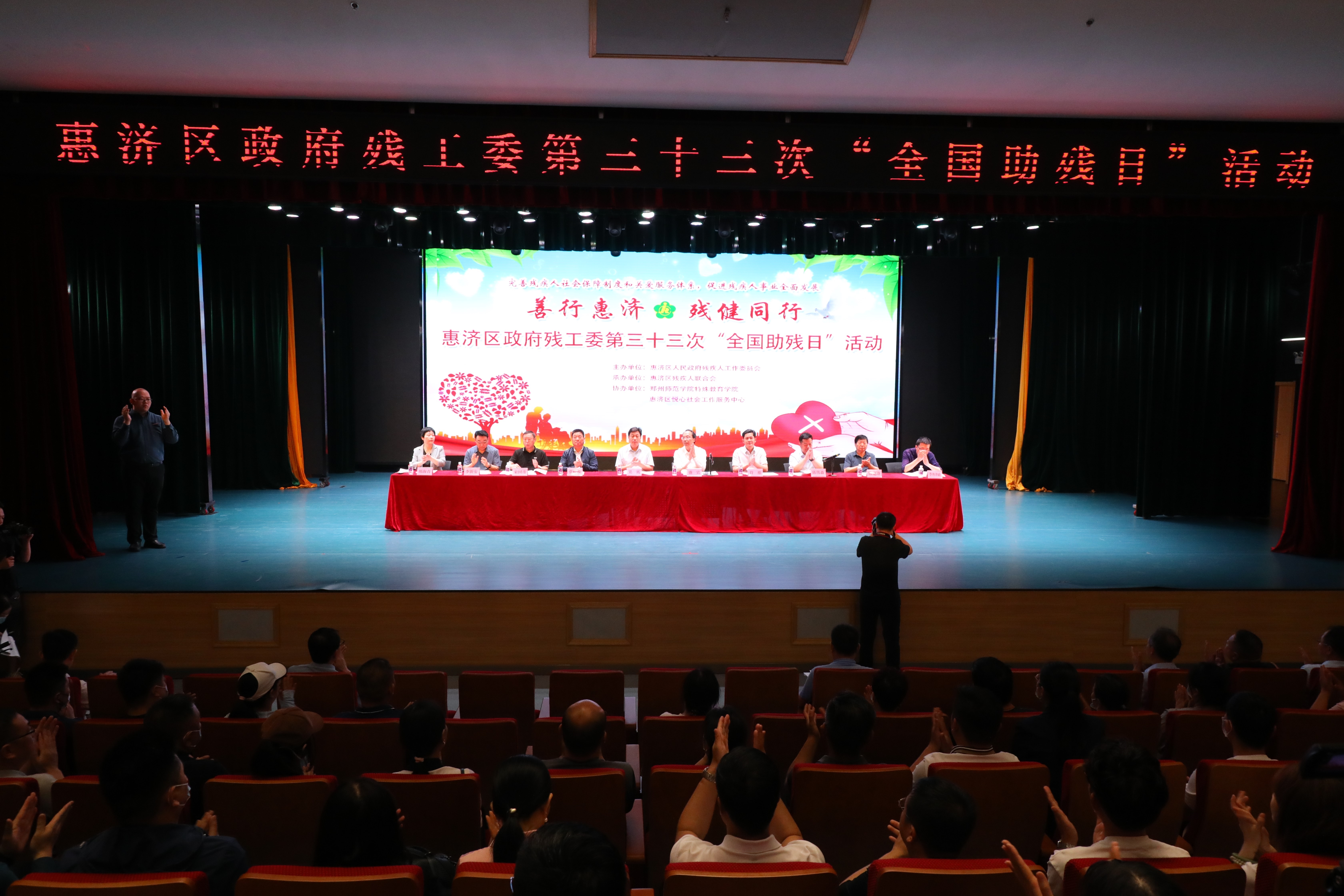 2023年5月18日上午,由郑州师范学院特殊教育学院和惠济区人民政府残疾人工作委员会、惠济区残疾人联合会共同举办的第33次“全国助残日”系列活动在我校拉开帷幕。此次“全国助残日”活动主题为:完善残疾人社会保障制度和关爱服务体系,促进残疾人事业全面发展。参会的领导有省残联党组成员、副理事长吴霄,郑州师院党委委员、副校长盛宾,市残联党组成员、副理事长张松振,区委常委、组织部部长、社治委主任符维,区人大常委会副主任宋国彦,区政协副主席李新安等,与会者还有惠济区各镇(街道)残疾人代表、残疾人工作者代表、受表彰单位和个人及大学生志愿者等400余人。