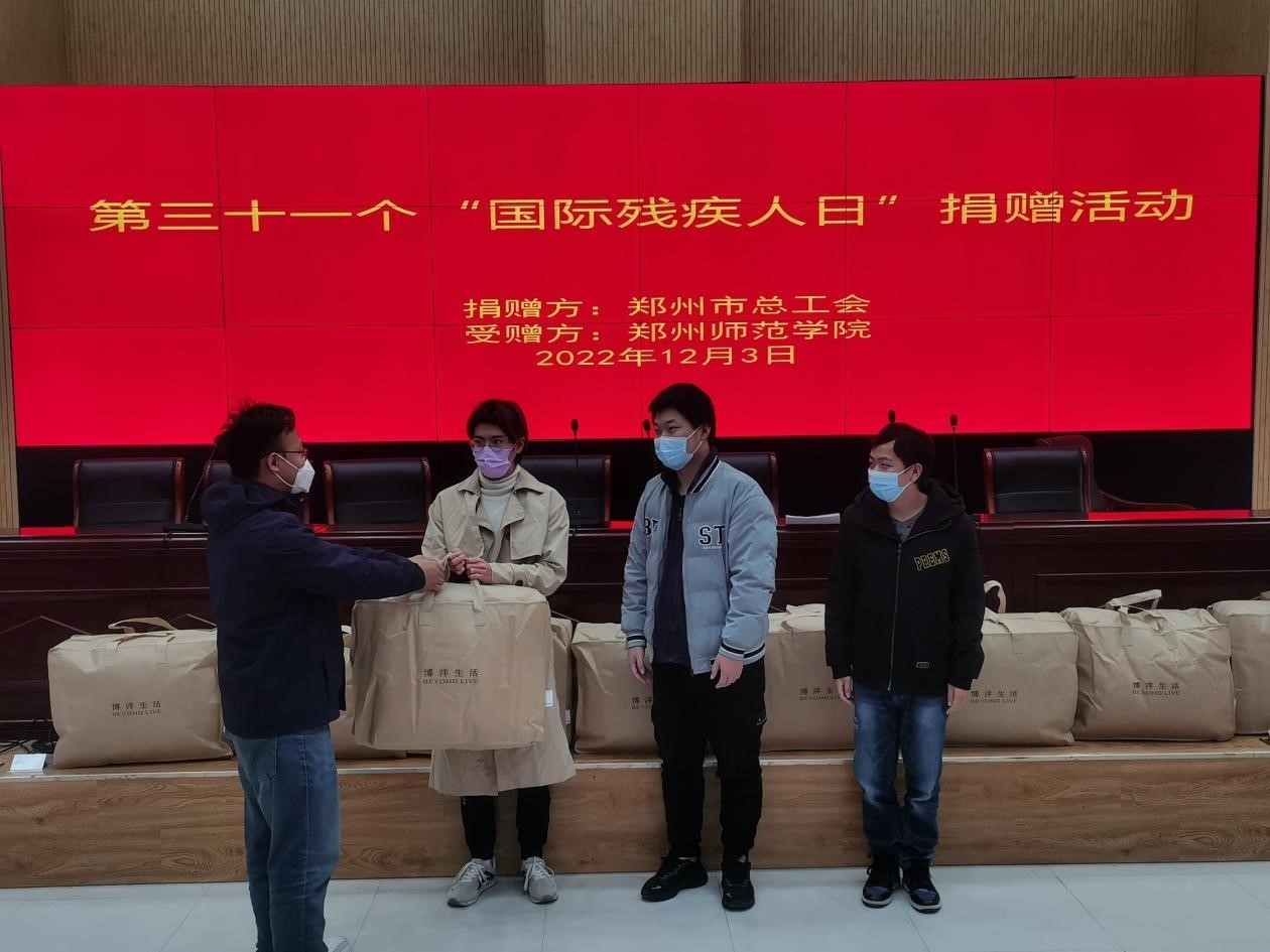 12月3日是第三十一个“国际残疾人日”,在校工会的大力支持下,上午9点,郑州市总工会,教科文卫体工会向我院残疾大学生开展了捐赠慰问的献爱心活动。