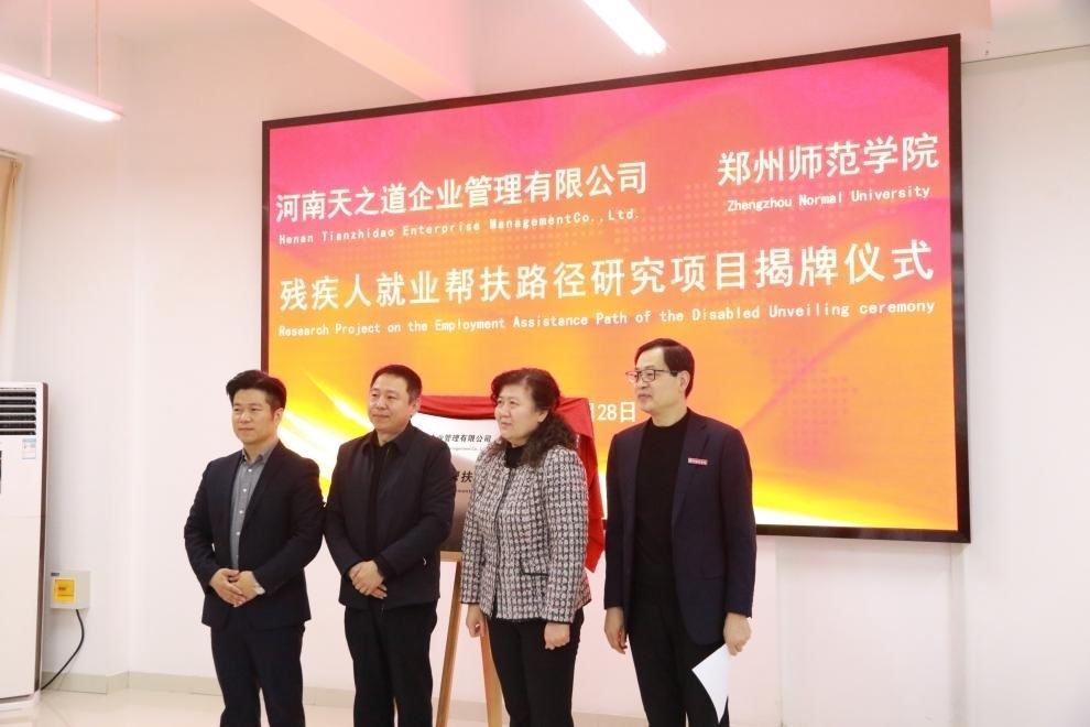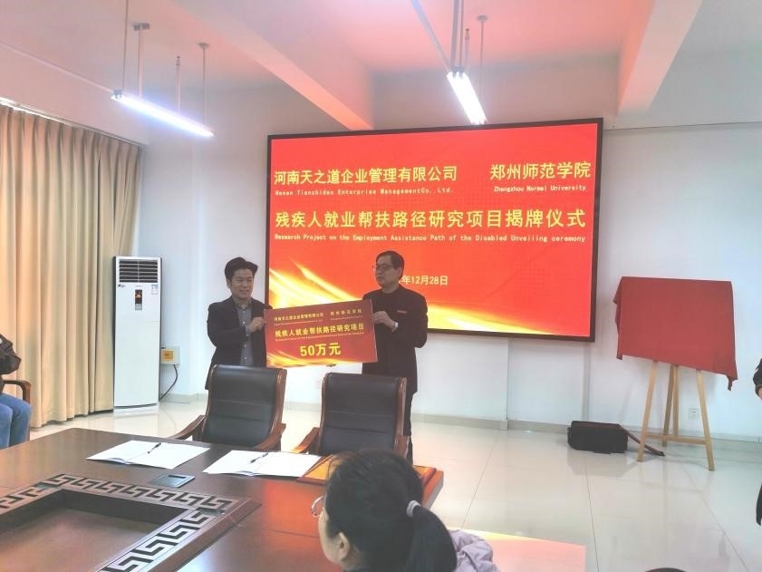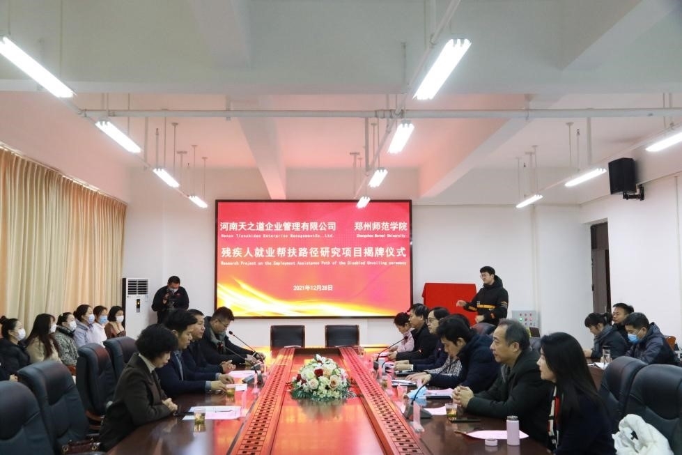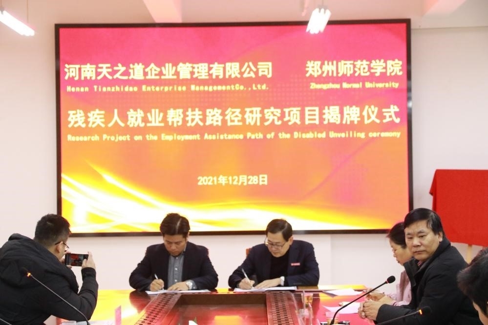 2021年12月28日上午9:00,我校与河南省天之道管理有限公司在尚志楼708举行残疾人就业帮扶路径研究项目暨天之道励志奖学金揭牌签约仪式。我校副校长蒋丽珠,省残联就业中心副主任吕建峰,科研处副处长晋争,教育科学学院院长陈国维及特殊教育学院全体领导班子参加了此次仪式。特殊教育学院院长高宏主持了此次仪式。