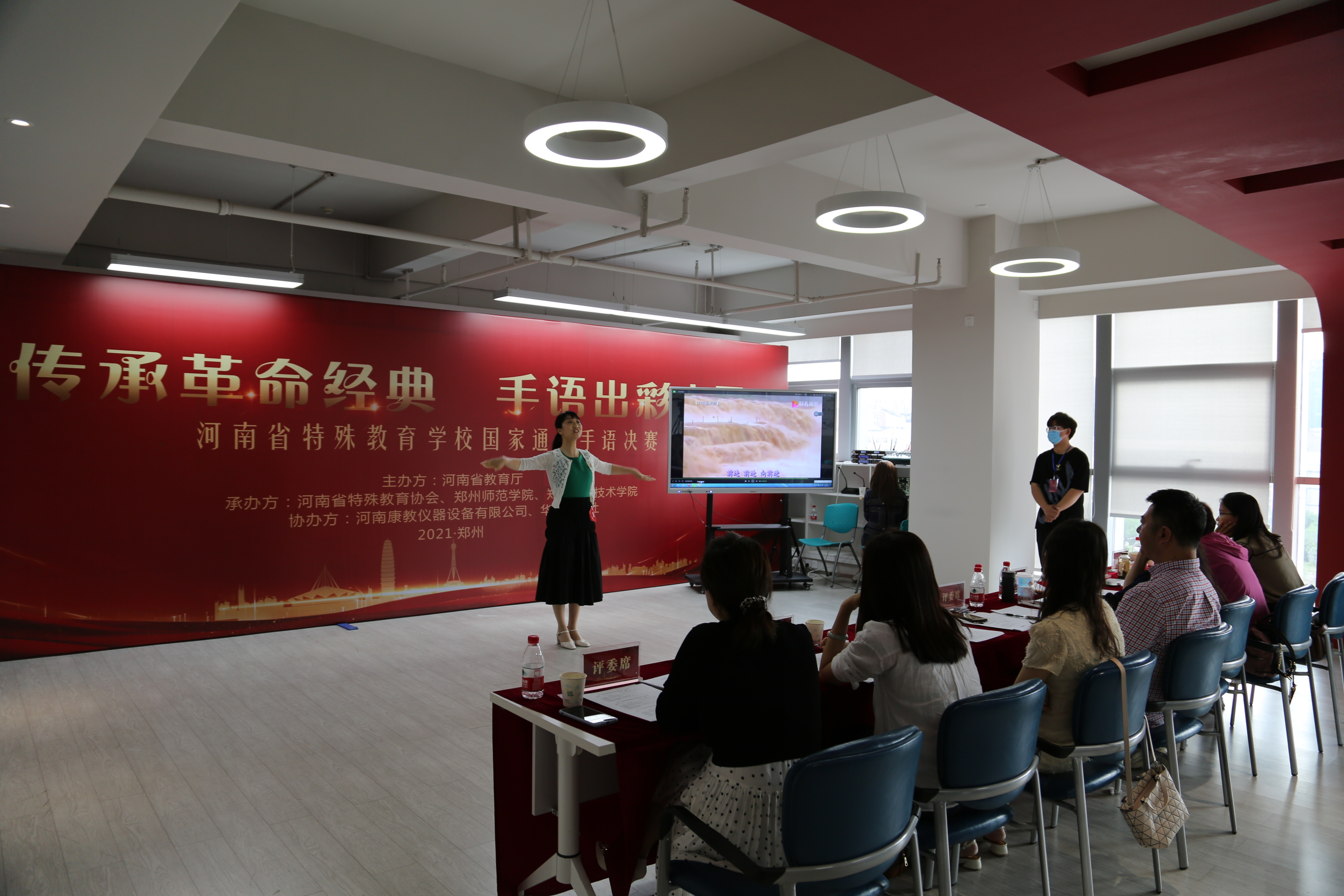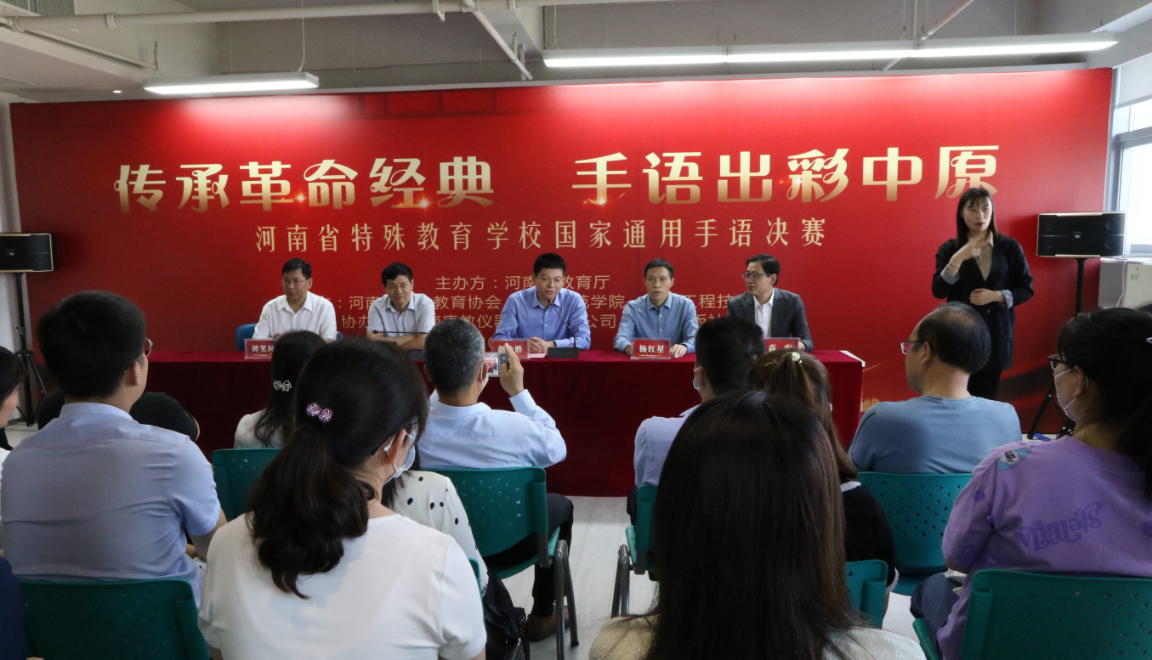 5月21日至23日,由河南省教育厅主办,河南省特殊教育协会、郑州师范学院、郑州工程技术学院等承办,以“传承革命经典,手语出彩中原”为主题的河南省国家通用手语大赛在郑州市正商向阳广场拉开了决赛的序幕。河南省教育厅基教处处长胡全胜、副处长杨红星、郑州师范学院副校长刘济良、郑州工程技术学院特殊教育学院党总支书记谭笑风、郑州师范学院特殊教育学院院长高宏出席了大赛。各级各类特殊教育学校选手经过激烈的初赛,复赛,最终有100名选手脱颖而出,参加此次大赛的决赛。