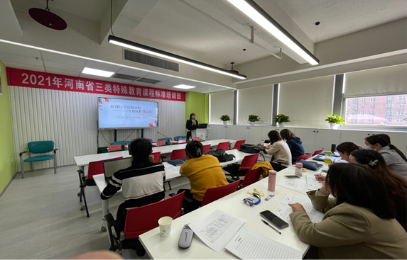 为健全我省特殊教育专业支撑体系,加强我省特殊教育师资队伍建设,提高教师专业化水平,2021年10月13日下午两点三十分,河南省三类特殊教育标准培训第三期(培智方向)开班典礼在郑州管城区正商向阳广场如期举行。郑州师范学院特殊教育学院院长高宏,郑州师范学院特殊教育学院副院长吴筱玫,河南省特殊教育协会副秘书长、河南省课程发展联盟办公室主任胡晓玉,河南省课程发展联盟继续教育中心主任陈希,培训班班主任孙庆宁、葛娟,以及来自全省各地市县区特殊教育学校80位参培教师出席开班典礼,此次典礼由吴筱玫副院长主持。