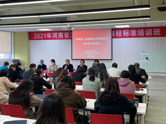 2021年10月25日下午,河南省三类特殊教育课程标准培训班第六期开班典礼在郑州市管城区向阳广场如期举行。郑州师范学院特殊教育学院书记申培新,特殊教育学院副院长李玉向,河南省特殊教育协会副秘书长、河南省课程发展联盟办公室主任胡晓玉,河南省课程发展联盟继续教育中心主任陈希,培训班班主任范海盈、汪明友,以及来自全省各地市县区特殊教育学校的61位参培教师出席开班典礼,此次典礼由李玉向院长主持,申培新书记致辞。