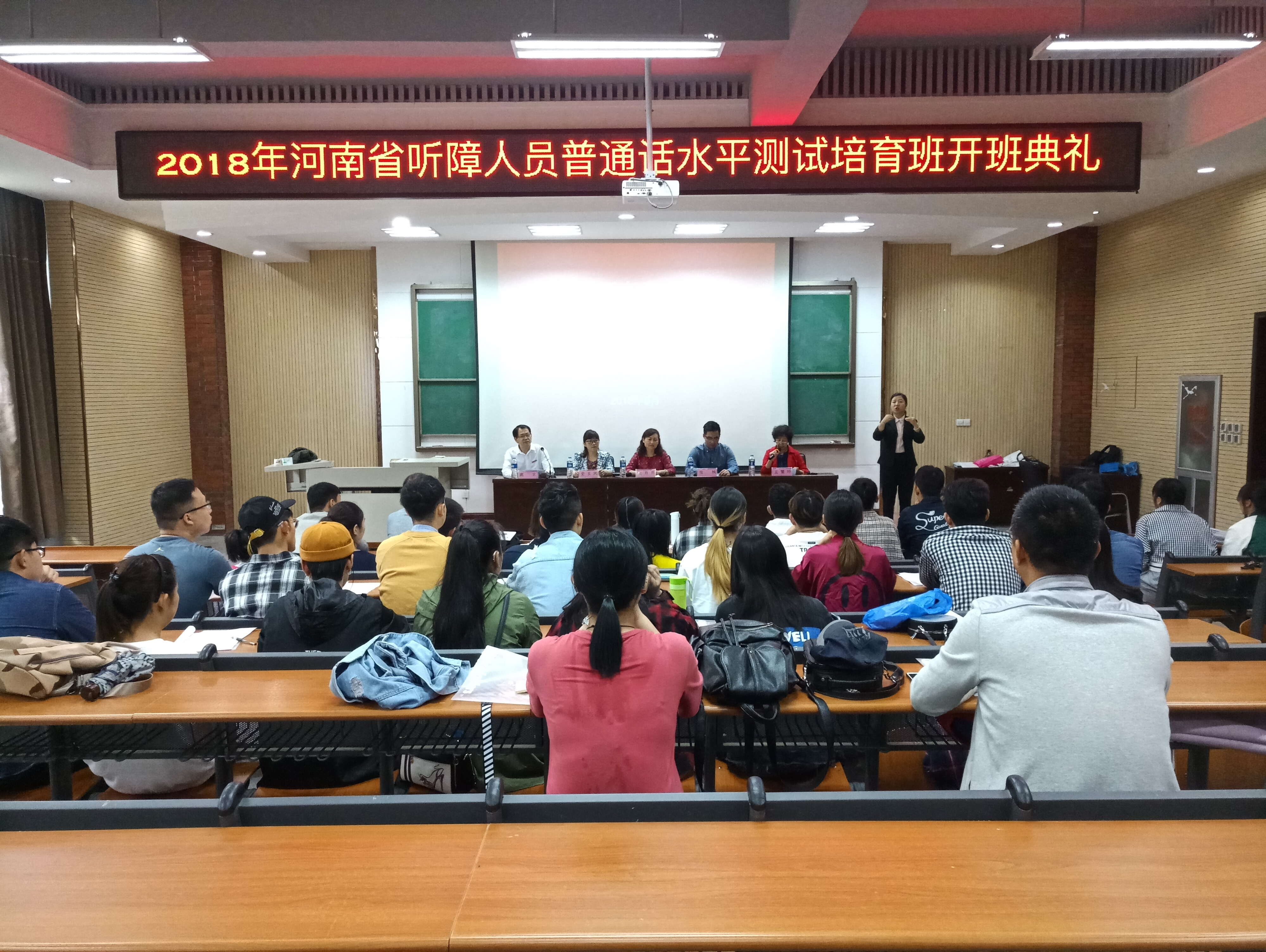 2018年9月16日上午,由河南省教育厅语言文字处和省语言文字培训测试中心主办,郑州师范学院承办的2018年河南省听障人员普通话水平测试培训班开班典礼在我校文博楼报告厅举行,中国盲文手语推广服务中心吴月芹副教授、史玉凤副教授、河南省语言文字培训测试中心的张楠同志、郑州工程技术学院特殊教育学院院长孟繁玲教授、郑州师范学院特殊教育学院院长高宏教授、手语翻译老师以及40余名听障学员出席此次开班典礼。典礼由高宏院长主持。