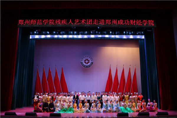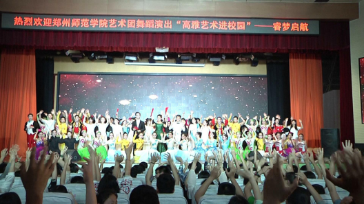 为响应国家教育主管部门促进高校素质教育,提升校园文化品位,丰富校园文化生活,引导大学生弘扬优秀民族文化的号召,我校在承接高雅艺术进校园活动的同时,也担负起高雅艺术进校园活动的演出任务。在各级校领导关怀下,郑州师范学院残疾人艺术团于2017年5月17日、18日、23日成功举办三场专场演出,走进郑州九中、郑州成功财经学院、河南交通职业技术学院,为五千余名师生带去了主题为睿梦起航的歌舞盛宴。