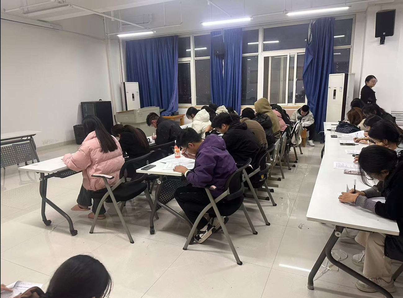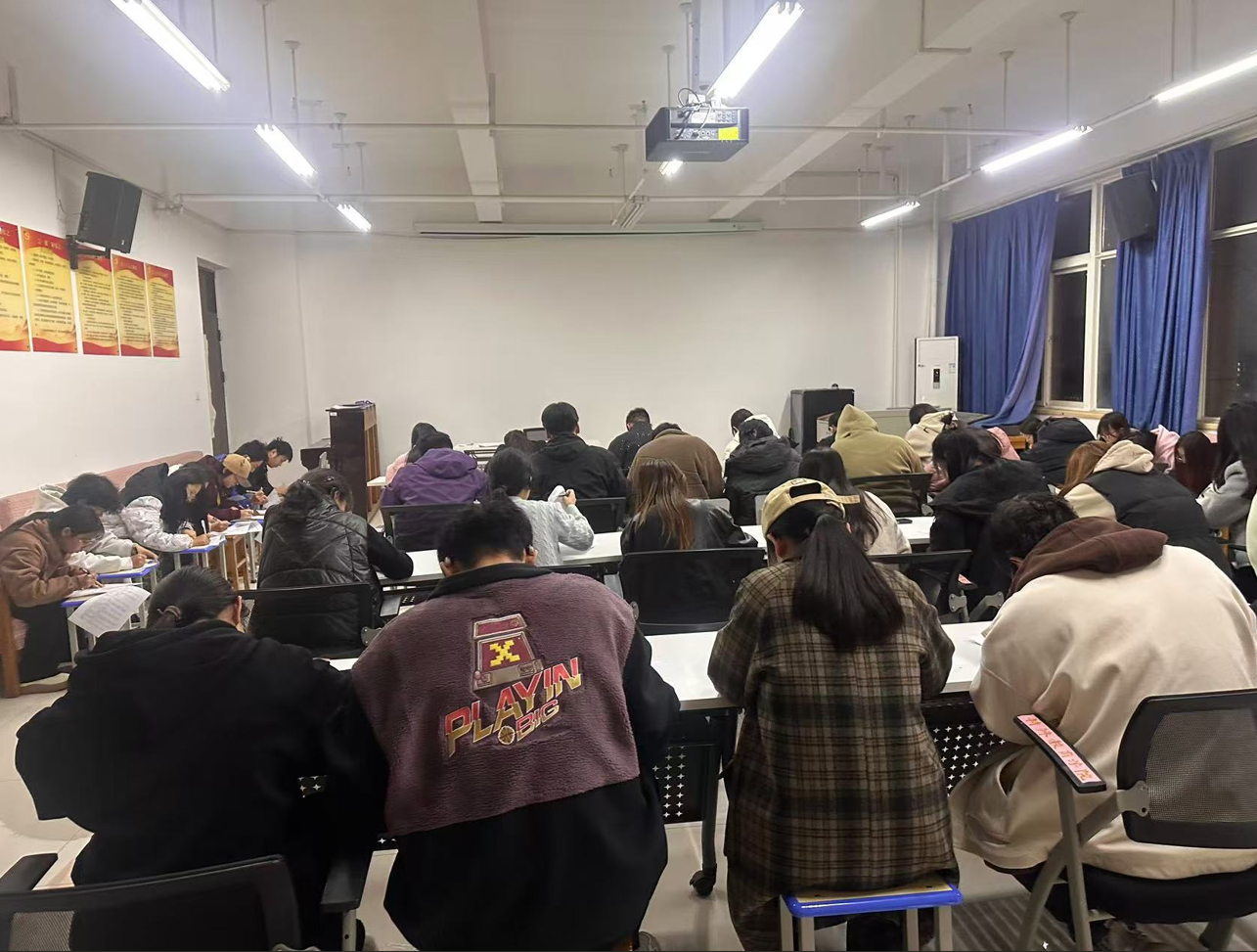 竞赛采用线下答题方式,试卷涵盖单选、多选、判断、填空等多种题型,现场气氛热烈,尚志楼1007室内座无虚席。参赛者们个个精神抖擞、全神贯注,只听见纸张翻动和笔尖摩擦的声音,每一位同学都沉浸在紧张的答题氛围中,为争取优异成绩全力以赴。