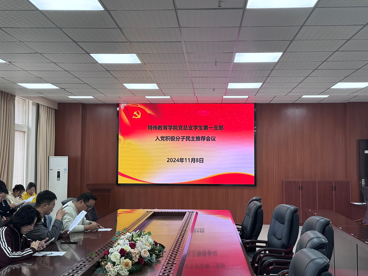 2024年11月8日下午,特殊教育学院党总支学生第一支部在尚志楼 708会议室召开民主双推积极分子会议。此次会议主要议题是推选优秀入党积极分子,充实党的新生力量,加强党组织建设。特殊教育学院党总支学生第一支部全体党员、预备党员及群众代表到会。会议由党支部书记钱学刚同志主持。