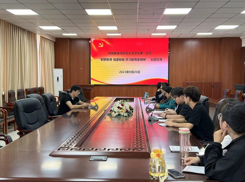 2023年9月20日下午,特殊教育学院党总支学生第一支部在尚志楼708召开“躬耕教育 强国有我 学习教育家精神"主题党课,会议集中讲述了习近平总书记在9月9日致信全国优秀教师的内容。特殊教育学院党总支学生第一支部全体党员、预备党员到会,会议由钱学刚同志主持。