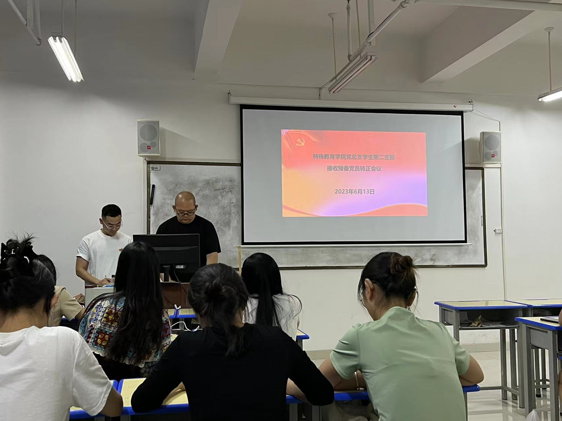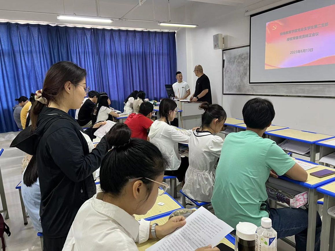 2023年6月13日,特殊教育学院党总支学生第二支部在尚志楼1006召开党员大会暨第二支部预备党员转正大会,大会主要议题是讨论接收学生第二支部预备期满的预备党员。学生第二支部全体党员、预备党员到会,会议由陈栋同志主持。