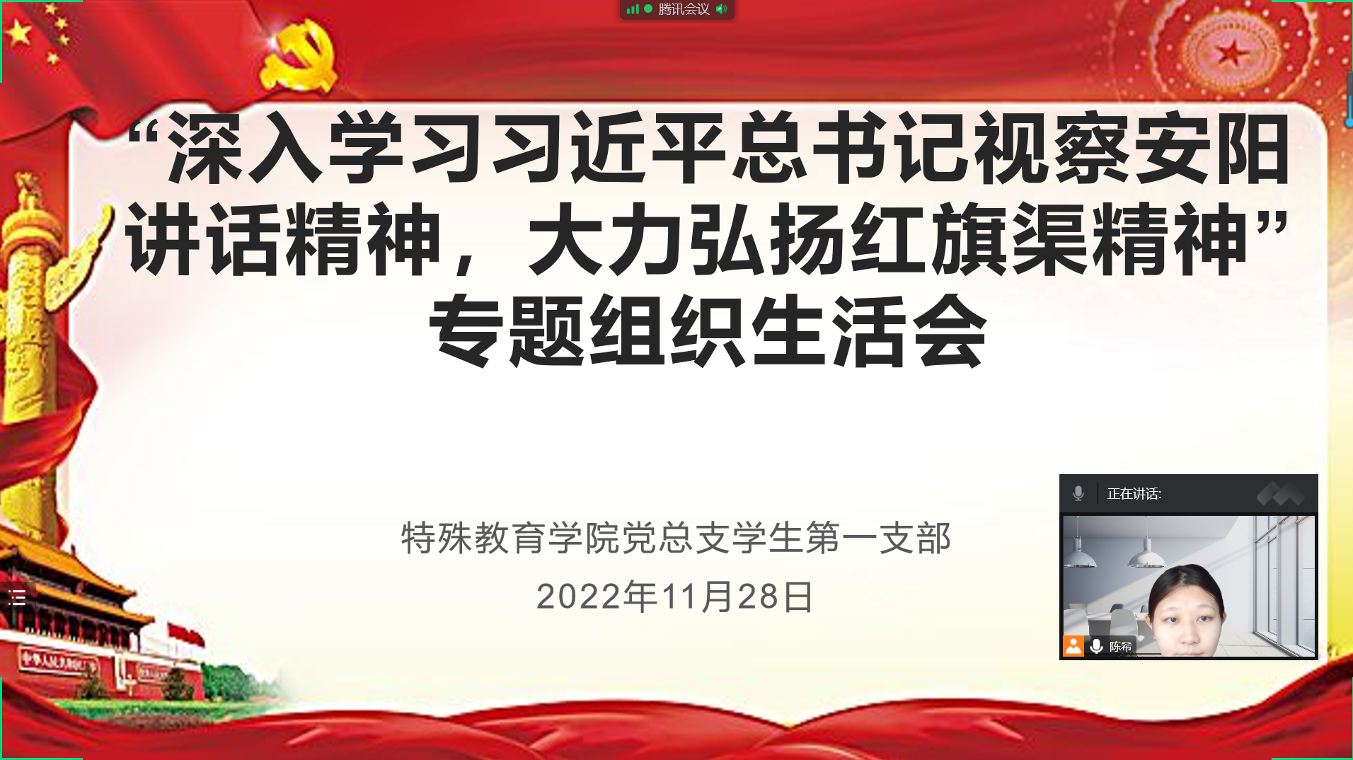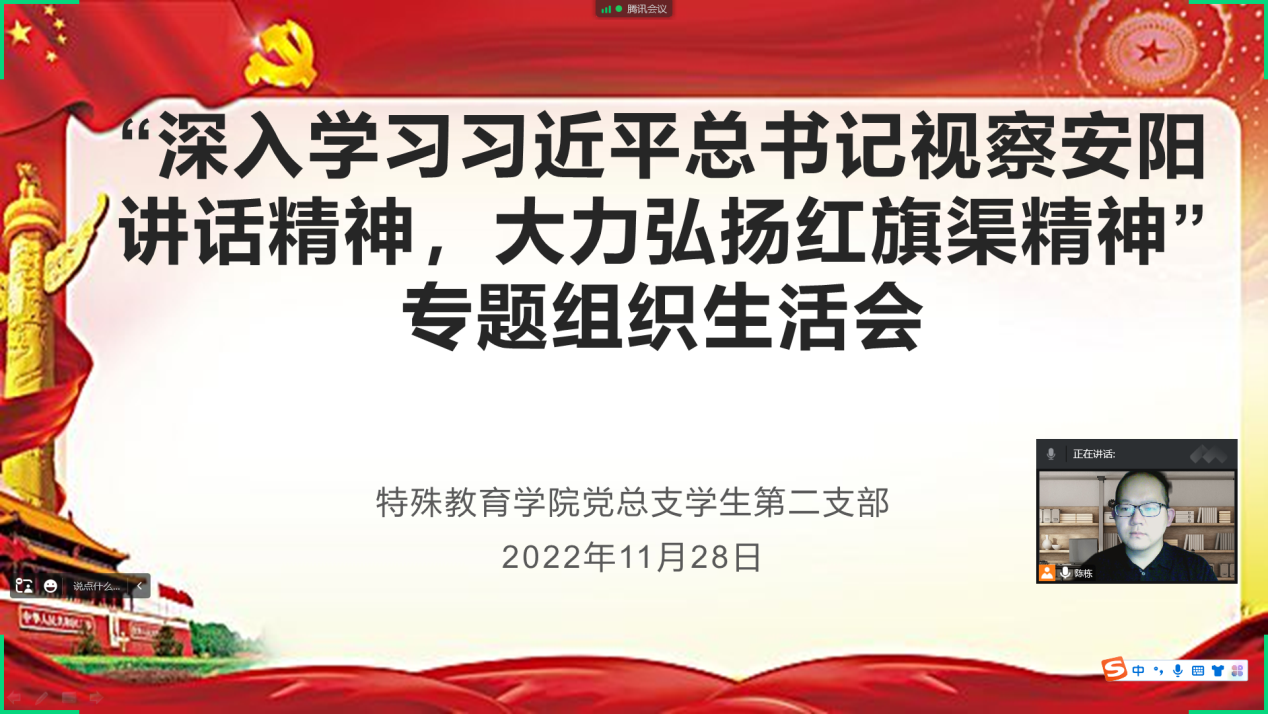 2022年11月28日,特殊教育学院党总支学生第一支部、第二支部召开专题组织生活会,学习讨论二十大报告相关内容及红旗渠精神。因疫情防控要求,本次会议采取线上方式召开。会议分别由特殊教育学院学生第一支部书记陈希同志、第二支部组织委员陈栋同志主持,第一、第二支部全体党员参加会议。
