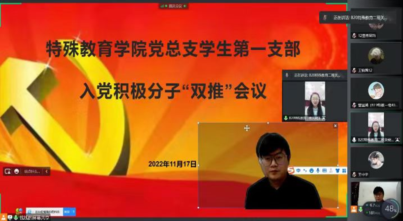 2022年11月17日下午,特殊教育学院党总支学生第一支部召开入党积极分子“双推”会议。大会讨论评议确定新的一批入党积极分子,一支部全体党员、发展对象和群众代表到会,会议由钱学刚同志主持。