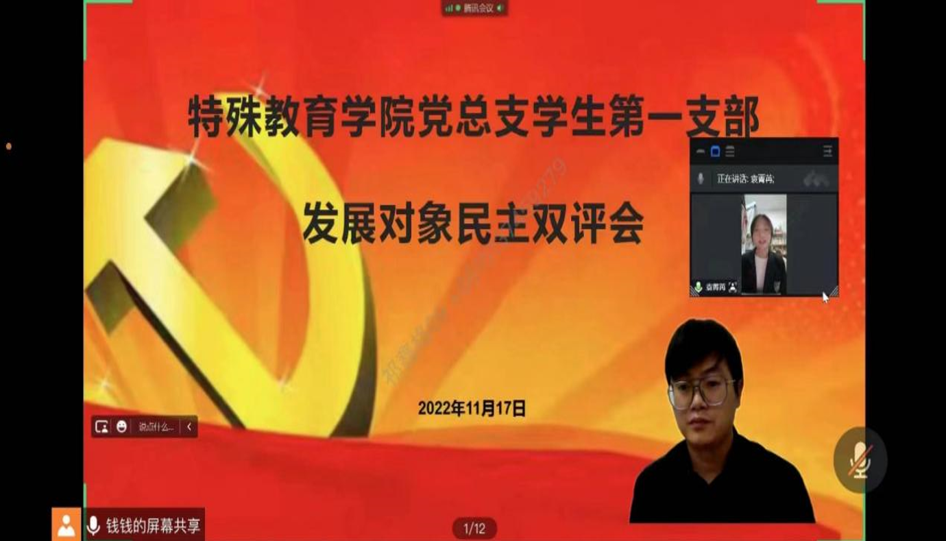 2022年11月17日下午,特殊教育学院党总支学生第一支部召开发展对象民主双评会,大会评议发展新的一批发展对象,学生第一支部全体党员、积极分子、群众代表到会,会议由钱学刚同志主持。