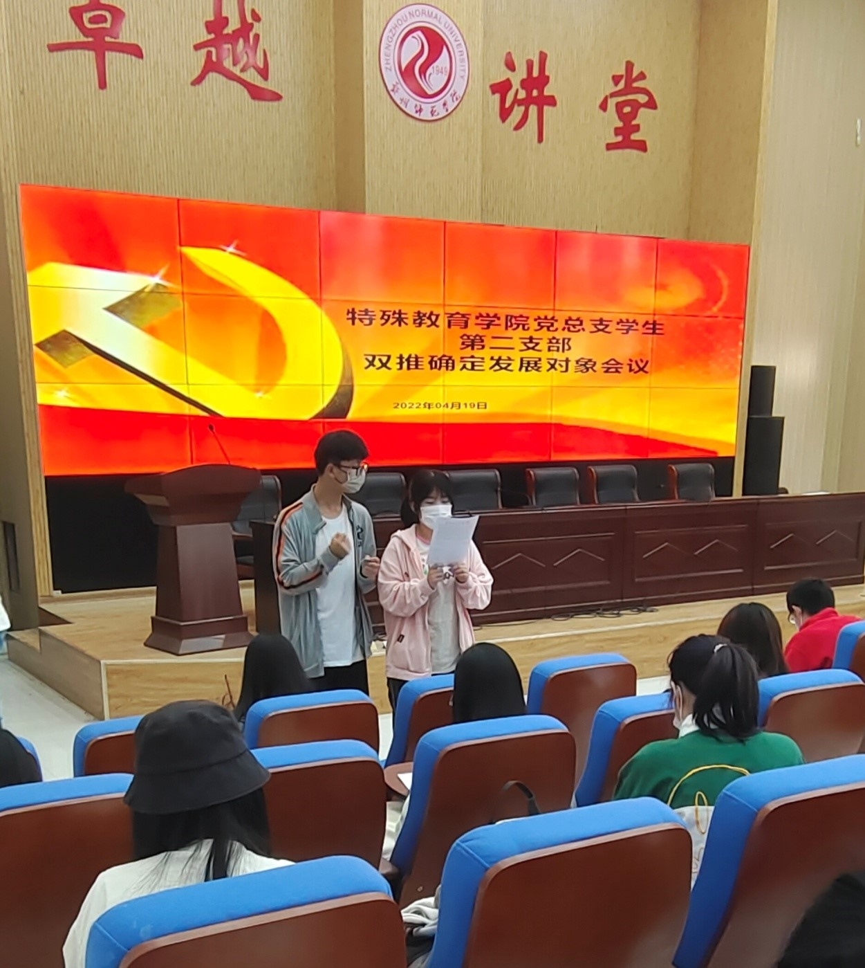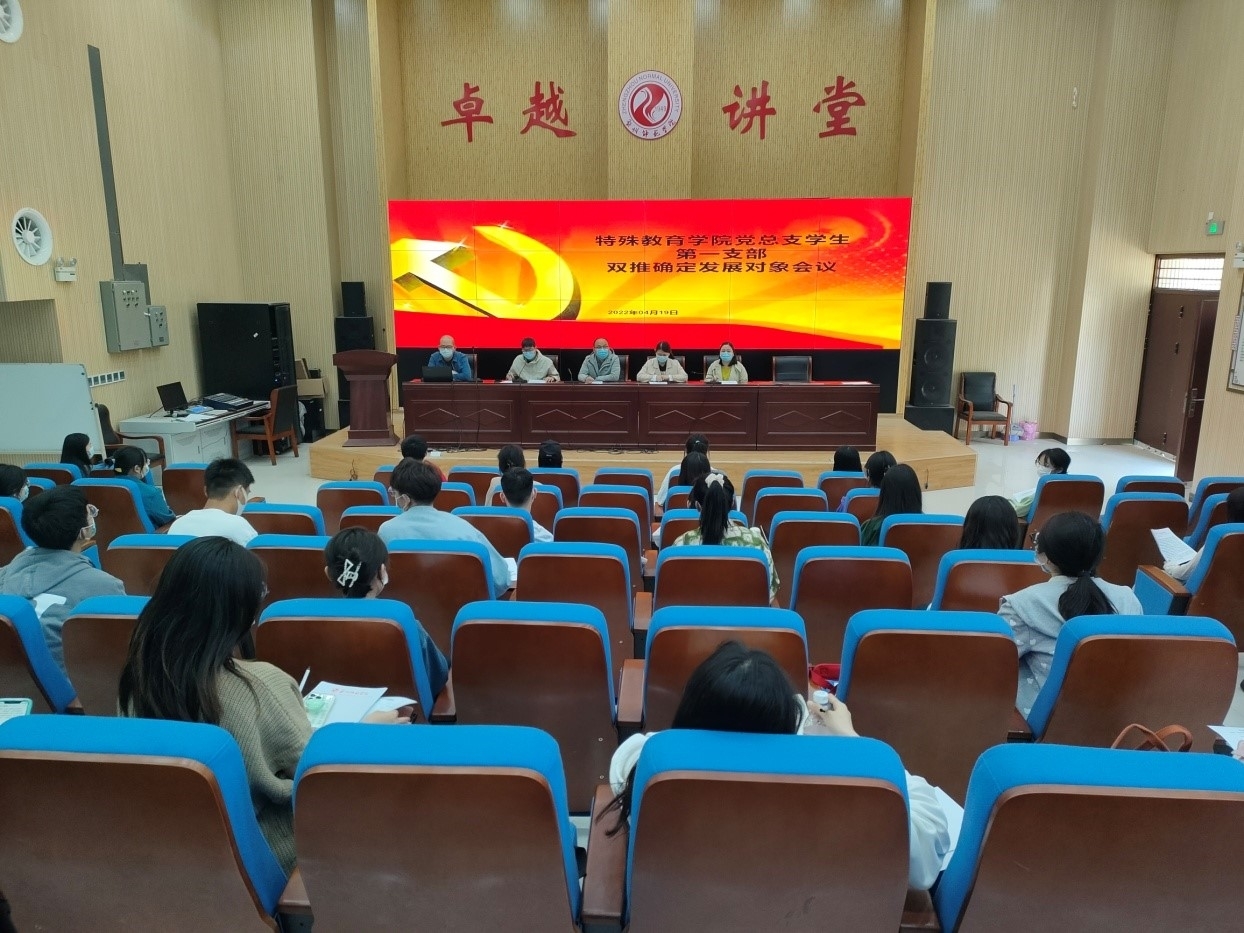 2022年4月19日下午三点,特殊教育学院党总支学生支部在卓越讲堂召开入党发展对象民主双推会。讨论确定新的一批发展对象,学生一、二党支部全体党员、预备党员、积极分子到会,会议由钱学刚同志主持。