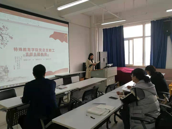 2019年10月15日,秋风习习,特殊教育学院党总支教工支部全体党员在党员活动室开展主题教育集中学习。根据主题活动方案安排,在支部书记吴筱玫主持下,全体党员对“习近平关于‘不忘初心、牢记使命论述’摘编”进行了认真研读,相互交流,深刻领会“摘编”的精神实质,并结合自身实际工作进行认真思考。通过这次学习活动,大家不仅增强了理论修养、拓展了知识面,而且明确了作为一名共产党员肩负的使命和责任,激励大家更加努力朝着中华民族伟大复兴的目标奋勇前进。