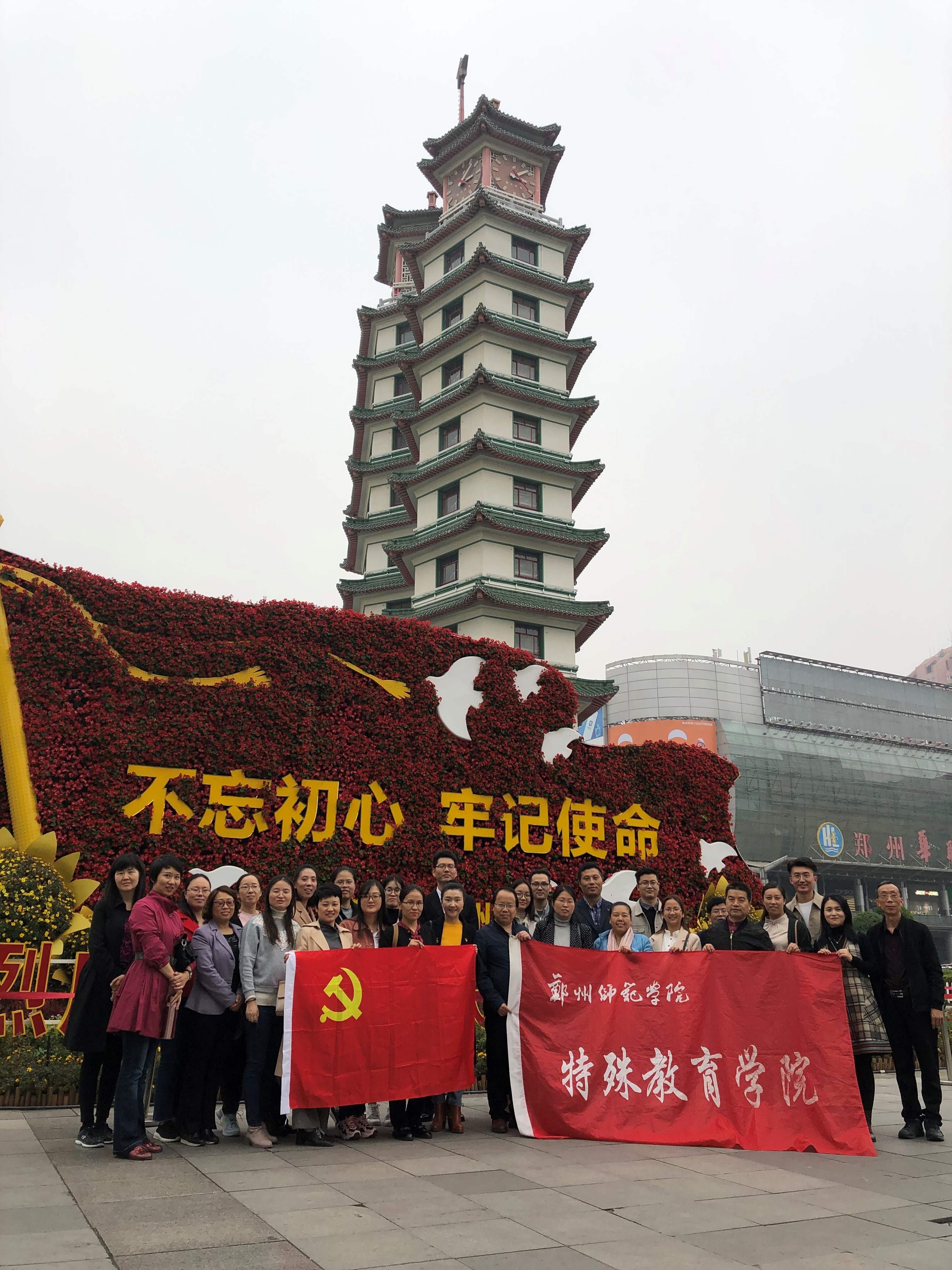 2019年10月22日下午,特殊教育学院党总支组织党员、教师来到郑州市地标性建筑——二七纪念塔,瞻仰革命先烈事迹,学习京汉铁路工人不向军阀低头的斗争精神,有效地推进“不忘初心、牢记使命”主题教育的开展。