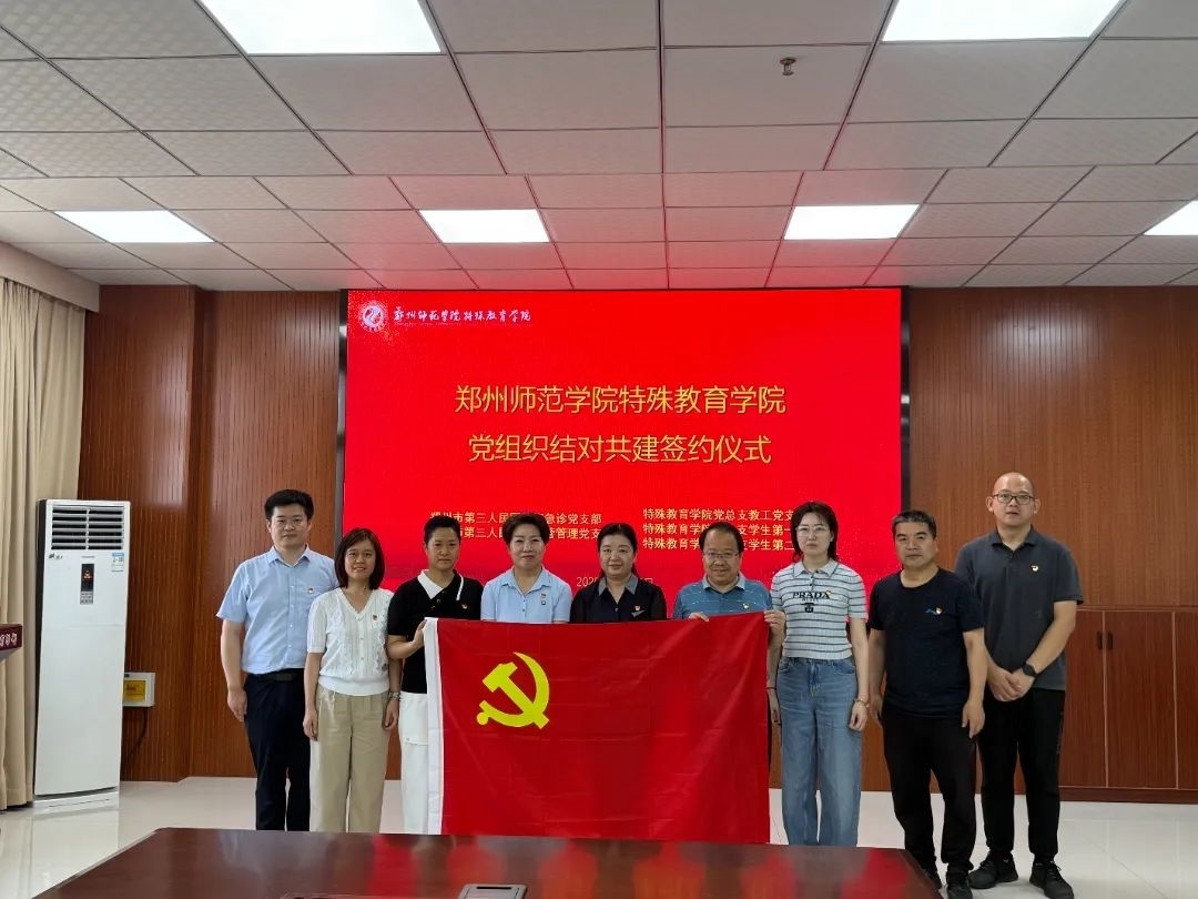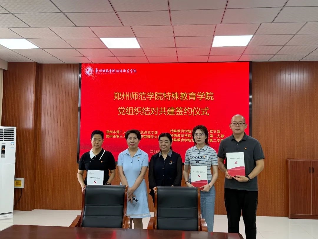 为充分发挥党建引领作用,推动党建与业务深度融合,2025年6月6日上午,特殊教育学院教工党支部、学生第一支部、学生第二支部与郑州市第三人民医院门急诊党支部、运营管理党支部在我校尚志楼708会议室举办签约结对共建活动。签约仪式由特殊教育学院党总支书记王智红主持,院长李玉向、副院长翟孟及学院党总支下属三个支部的委员,郑州市第三人民医院党委专职副书记李瑞、市三院党委办公室主任、门急诊党支部书记和运营管理党支部书记共同参加了签约仪式,并就下一步党建引领医教结合具体事宜展开讨论。