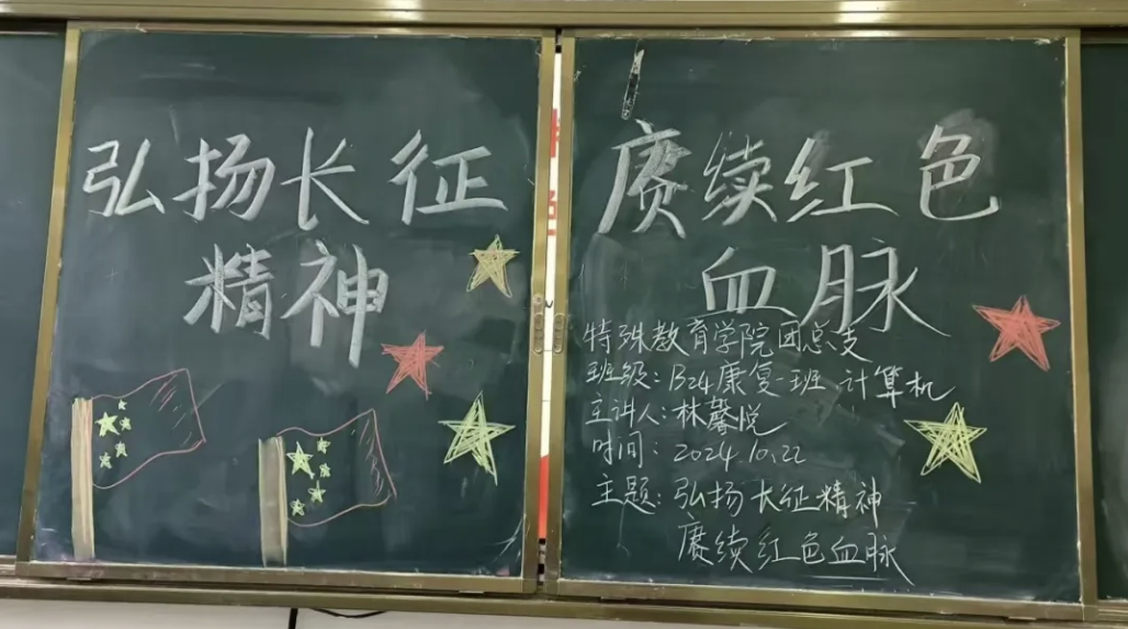 长征壮举千秋颂,热血传奇映碧空。在历史长河中,长征如一座不朽的丰碑,矗立在中华民族的精神高地。时光流转,岁月更迭,长征精神如璀璨星辰般闪耀,照亮中华儿女前进的道路。为使同学们深入了解长征精神、践行长征精神,从而铭记历史、传承理想信念、培养艰苦奋斗精神。特殊教育学院团总支于2024年10月22日召开以"弘扬长征精神,赓续红色血脉"为主题的政治学习会议。