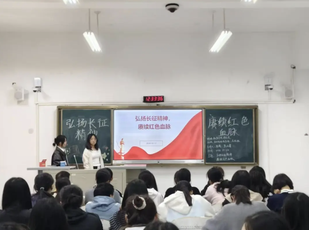 随后,主持人进行了弘扬长征精神、践行社会主义核心价值观的讲说,来培养新时代青年的责任感与使命感,促使同学们传承好红色基因,勇于担当大任。“纸上得来终觉浅,绝知此事要躬行。"对此,主持人还提出可以进行重走长征路的实践活动,或到红色教育基地参观学习,让同学们投身于红色实践中,去感知历史的痕迹,触摸时代的脉络,从而展望未来,更好地书写属于我们的精彩华章。