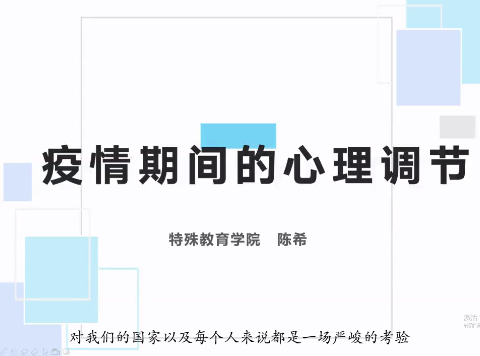 发生在岁末年初的新冠肺炎疫情,对我们的国家以及每个人来说,都是一场严峻的考验。它不仅给大家带来身体伤害,同时也给大家的心理带来了巨大的冲击和挑战。目前,多地出现了新增病例连续零增长,疫情防控向好发展的态势,但境外输入的风险也仍在增加。所以,现在正是全民抗击疫情的关键阶段。为了贯彻落实国家疫情防控工作的要求,帮助同学们做好疫情防控期间的心理防护,特殊教育学院组织了主题为“疫情期间的心理调节”的安全教育微课堂,此次微课堂由陈希老师以视频形式开展。