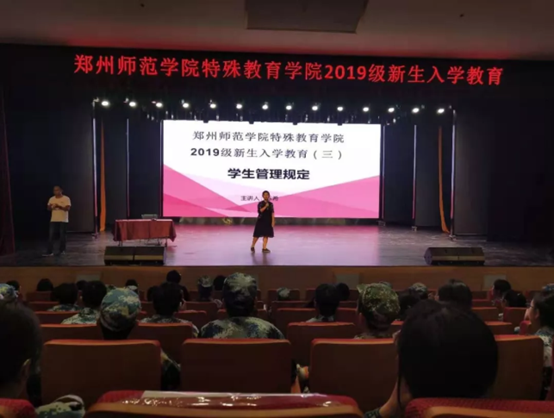 2019年9月22日晚上六点半,郑州师范学院特殊教育学院于梦想剧场召开了第三次新生入学教育,主要内容为“大学生活的点点滴滴”。本次入学教育的主讲人为陈希老师。