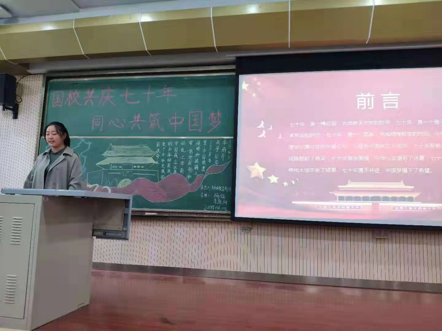 为庆祝中华人民共和国成立70周年,加强对2019级新生的爱国主义教育,增强大学生的爱国意识及民族意识,特殊教育学院团总支组织了2019级学生在文汇楼B112召开了以“国校共庆七十年,同心共筑中国梦”为主题的政治学习会议。此次会议由李疏桐同学主持。