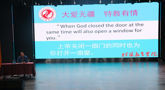 首先,高宏院长向大家介绍了特殊教育学院一直以来所强调的八个字:大爱无疆,特教有情。对于同学们选择了特殊教育这个专业,高院长指出,这是非常正确、智慧的选择。作为一门新兴学科,特殊教育的潜力是巨大的。而未来作为特教老师的我们,承担的责任也会更加艰巨。面对这些孩子,特教老师要付出比普通老师多五倍、十倍甚至更多的精力。因此,高院长指出,特殊教育是一个神圣的职业,需要为此不断奋斗,才能让特殊教育的未来更加美好。