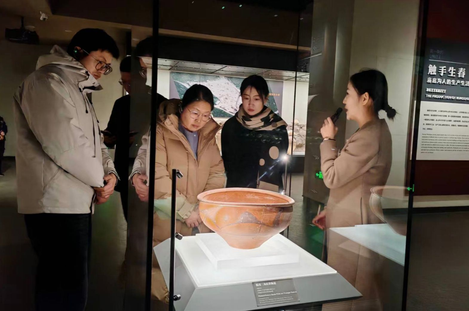 调研团队首站走进三门峡庙底沟博物馆,该馆作为黄河文化遗产保护利用核心载体、国家考古遗址公园重要组成部分,近年来深耕“馆校合作”模式,通过青少年艺术展、流动展览进校园等活动推动仰韶文化传承。调研团队实地考察了博物馆展厅布局、文创教育空间及研学活动设施,与馆长王宏民围绕文化教育融合、实习岗位供给、残障融合志愿服务和研学课程开发等议题展开座谈。教育学部吴筱玫介绍了学校特殊教育、艺术设计等专业优势,重点提及“理论+实践+创新”三位一体培养体系在文化素养教育、聋人大学生美育和文创产品开发等领域的实践成果;博物馆方则表示希望在残障融合方面联合开发仰韶文化特色研学课程,挖掘艺术设计专业听障大学生的文化创意潜力,建立大学生志愿服务和实习实践基地,实现文化传播与人才培养双向赋能。