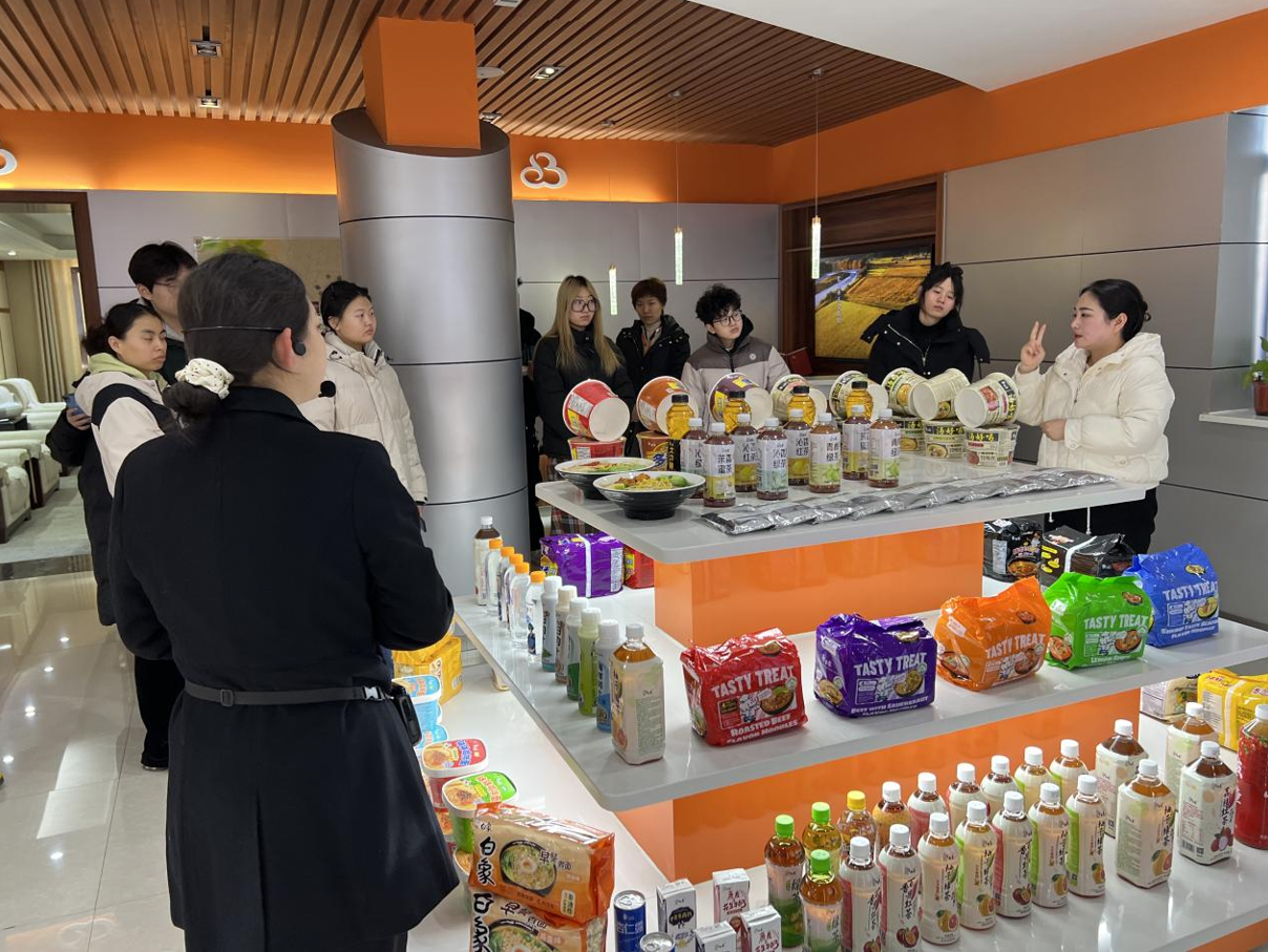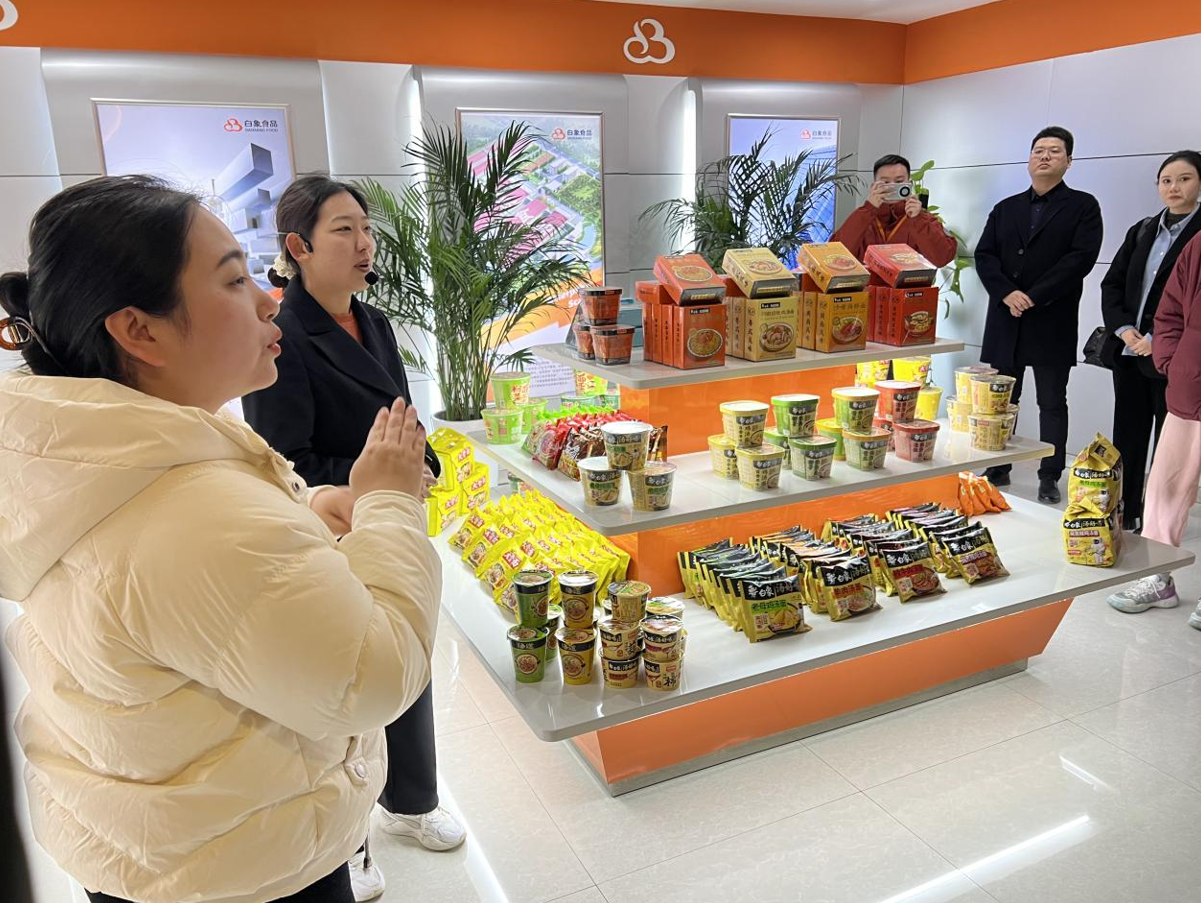 抵达白象食品股份有限公司后,白象食品股份有限公司代表张宇珉热情接待了师生一行。张宇珉以生动且详实的方式,介绍了白象食品集团的多元工作内容,从食品研发的创新理念,到生产制造的先进工艺,再到质量检测的严格标准,以及市场营销的策略与物流配送的高效运作,全方位展示了集团的业务范畴。同时,张宇珉带领师生们参观了现代化的生产车间,车间内整洁有序,高度自动化的生产线有条不紊地运行,安全卫生的食品加工环境给师生们留下了深刻印象。舒适宜人的办公区域,也彰显了集团以人为本的企业文化。