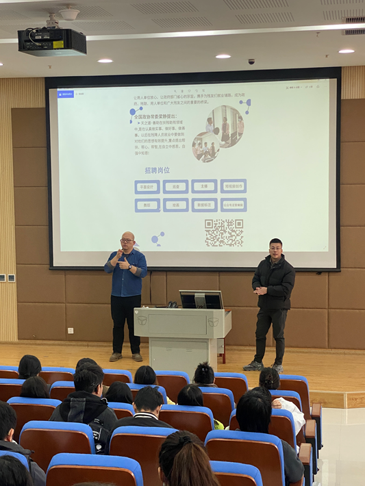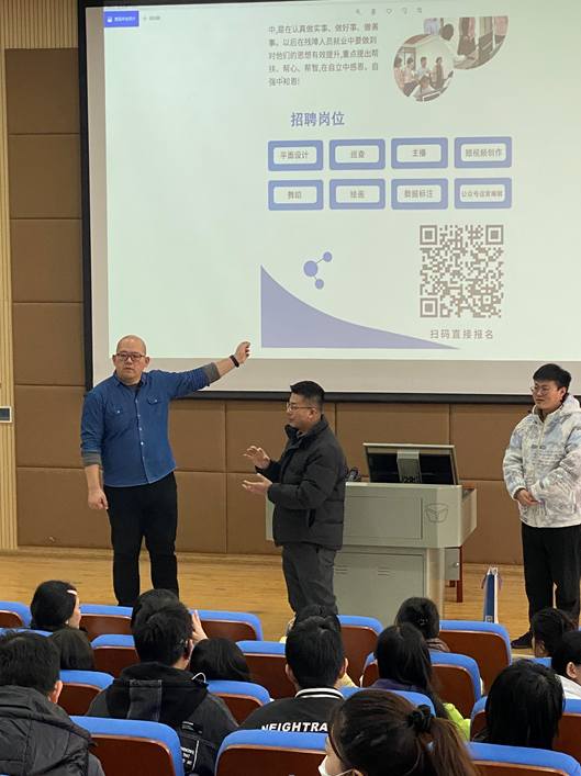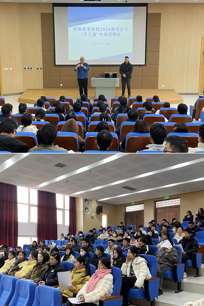 2023年12月26日下午,特殊教育学院在尚志楼3楼学术报告厅举行特殊教育学院2024届毕业生生专场招聘会。本次招聘会邀请河南天之道·善助的负责人蒋凌益、电商运营负责人马博和该企业优秀员工我院22届校友丁玉洲到院宣讲,2024届聋人大学生和三年级部分学生参加此次专场招聘会。在招聘会上,公司负责人蒋凌益向参会同学们详细介绍了公司的规模大小、发展前景、业务内容及职位招聘以及目前校企合作的进展。重点解答了同学们关心的薪资、工作内容等问题,他还提到这次是连续第三年来到我院开展专场招聘会,表达了对我院听障大学生职业能力的高度认可。招聘会现场气氛活跃,同学们积极地提出自己的疑问,天之道·善助企业相关负责人耐心地一一为同学们解答,并与部分学生进行了深入交流。