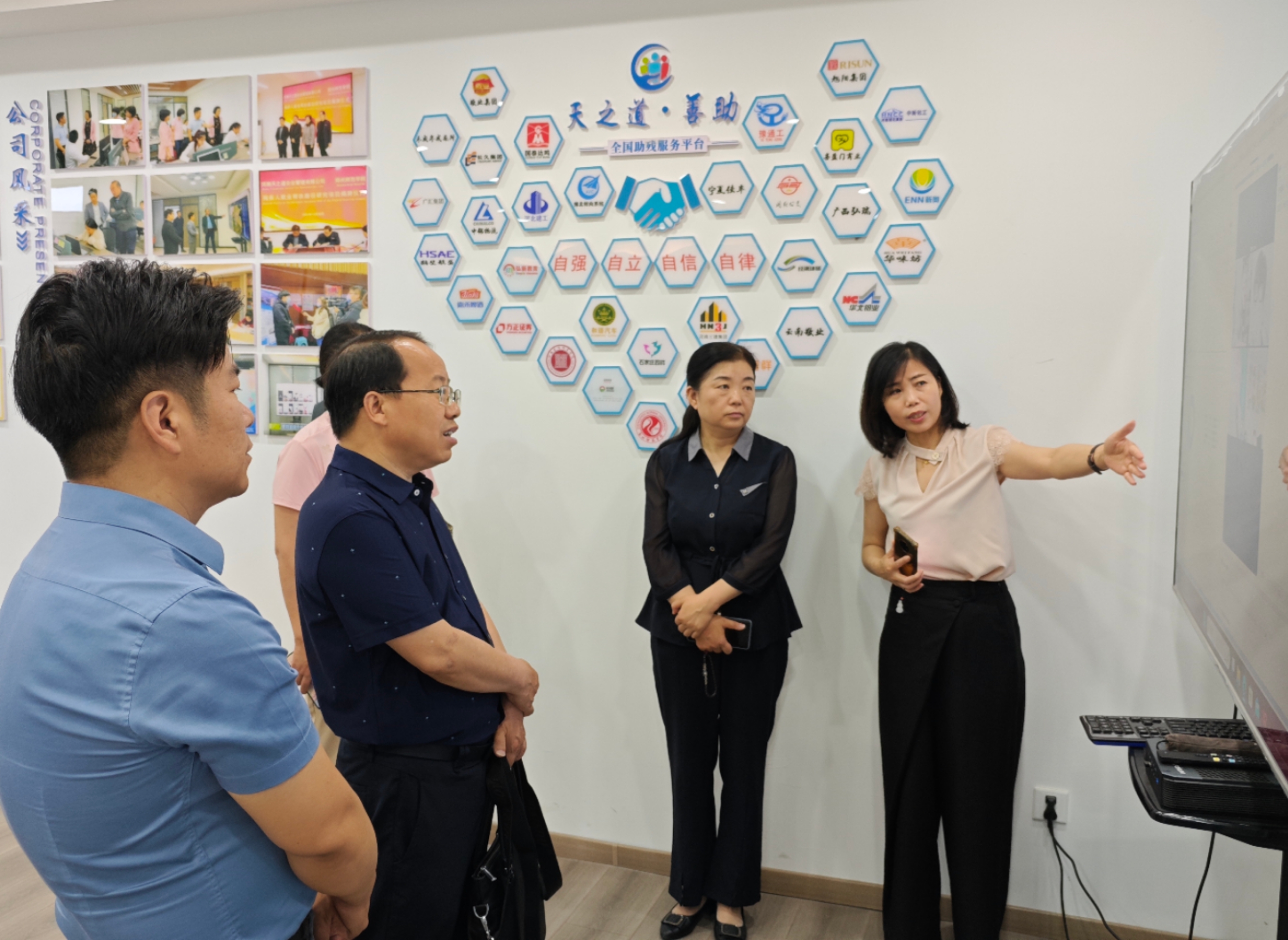 随后,王书记一行赶往河南天之道企业管理有限公司。在公司总经理张健国和总监梁杰的陪同下,特殊教育学院领导班子一行参观了公司的办公环境、企业文化展示区以及残疾人直播带货运营情况,并了解该公司近年来吸纳我校毕业生就业情况。在参观过程中,双方围绕如何为听障大学生创造更多元化的就业机会展开热烈探讨。随后的座谈会上,双方就人才培养、实习实训、毕业生就业创业等方面开展深度交流,并为下一步开展更深层次的校企合作达成共识。