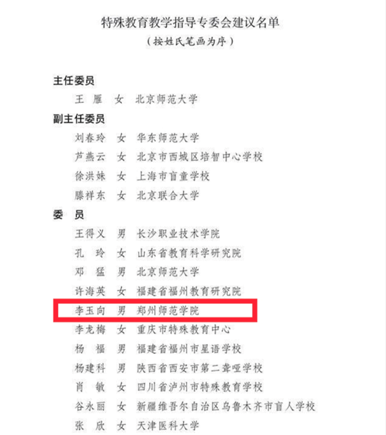 近日,教育部公示了基础教育教学指导专业委员会委员名单,确定了语文等25个教育部基础教育教学指导专业委员会委员人选,其中,郑州师范学院特殊教育学院的李玉向副院长被选为教育部特殊教育教学指导专委会委员。