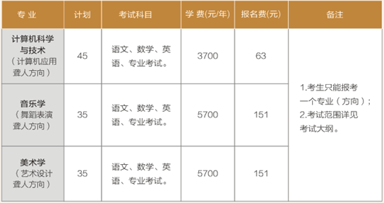 2. 音乐学(舞蹈表演聋人方向)、美术学(艺术设计聋人方向)专业录取时按照(文化成绩×30% +专业成绩×70%)的计分方法排序,从高到低录取,完成招生计划;